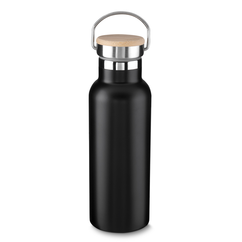 Garrafa térmica em aço inox com parede dupla isolada a vácuo, com capacidade de até 500ml. Tampa rosqueável com revestimento em fibra de bambu. Alça em metal. Detalhe cromado. Pintura fosca.
